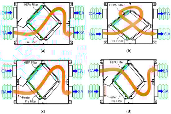 Figure 4 shows the proposed purge methods used to remove condensation by circulating the RA. The proposed purge methods include (a) normal purge, (b) circulation purge, (c) heat purge, and (d) outward purge. As shown in Figure 4a, the normal purge method is used to remove the accumulated condensation by directly passing the heat exchanger element and then, the RA is supplied indoors without being discharged to the outside. In the circulation purge method, as shown in Figure 4b, the RA passes the heat exchanger element and then reenters it through the OA flow path, which has a high efficiency particulate air (HEPA) filter. The HEPA filter acts as an indoor air purifier. However, if condensation is accumulated in the HEPA filter without being completely removed, the performance of the heat recovery ventilator can decrease. In the heat purge method, as shown in Figure 4c, a heater installed at the RA inlet provides heat to the RA, which can remove condensation instantly with minimum energy loss owing to the limited operation of the heater under the purge condition. Conventionally, condensation has been reduced by decreasing the temperature difference between the OA and RA by using a heater on the OA side; however, this can decrease the total heat transfer performance and increase total energy consumption. As shown in Figure 4d, the outward purge method is used to remove condensation in the summer condition. The condensation accumulated in the heat exchanger is removed by the OA with high temperature and the OA is then discharged to the outdoor to prevent any discomfort from the hot and humid air entering into the indoor area.