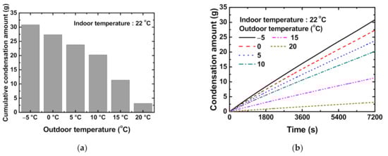 Results of 2 h operation for Case 1: (a) cumulative condensation quantity according to outdoor temperature; (b) condensation quantity over time.