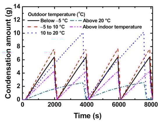 Figure 11 shows the amount of condensation over time when the proposed optimum ventilation and purge strategies are used in the heat recovery ventilator. As the outdoor temperature increased, the rate of increase in the quantity of condensation over time decreased except for when the outdoor temperature was below −5 °C, owing to the use of the mixed ventilation method. For the outdoor temperatures from 10 to 20 °C and above 20 °C, the purge interval was changed to 1 h instead of 30 min owing to the small amount of condensation. Overall, based on the use of the proposed optimum strategies, the amount of condensation in the heat recovery ventilator was controlled to below 10 g during the entire operation time, which yielded a substantial reduction in the amount of condensation compared with that without the purge. When compared to Case 1, which uses the conventional ventilation and heat purge with a purge interval of 2 h, the proposed purge strategies showed at least a 33% up to 80% of condensation reduction in the range of the outdoor temperature from 20 to −5 °C. Accordingly, the optimum strategies proposed in this study can effectively reduce the growth of microorganisms and fungi and also increase the heat recovery efficiency of the heat recovery ventilator by significantly decreasing the amount of condensation. However, further study is necessary to reflect various outdoor humidity conditions and to conduct overall energy analysis on the ventilator with electric heaters for the heat purge.