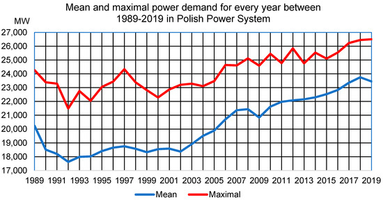 Mean and maximal power demands in MW, for every year between 1989 and 2019 in the Polish Power System (PPS) [18].