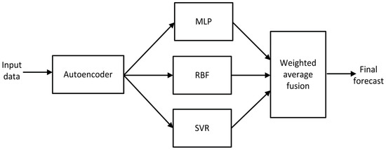 The signals of the last hidden layer are treated as the diagnostic features, which are put to the input of three networks: Multilayer perceptron, radial basis function network, and support vector machine with Gaussian kernel, working in regression mode. These three units form the members of the forecasting ensemble. The general structure of the whole system is presented in Figure 4.