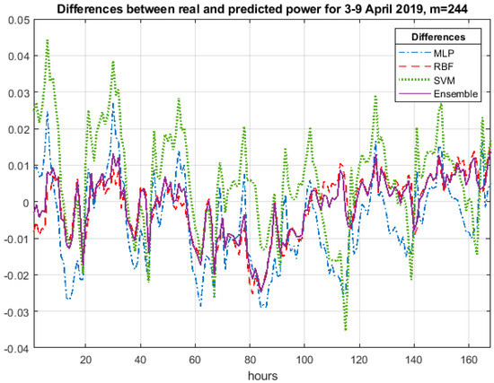 Figure 5 presents the average hourly testing errors for one randomly selected week (3–9 April) of 2019 at the application of exponent m = 244. In most hours, the result of the ensemble follows the best predictor (RBF). This happens when the polarity of errors of the predictors is the same. However, for some hours, different polarity of actual errors committed by the ensemble members can be observed. This provides the field for compensation of error values. These two tendencies: Compensation of different polarity errors and preference of the best predictor, have resulted in a very high value of exponent m.