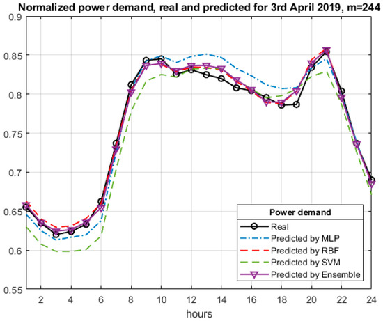In the next stage, the optimal structure and parameters of neural networks have to be defined. They include the number of neurons in MLP, the number of centers in RBF, as well as the kernel function type and parameters of the kernel function, and the regularization parameters in SVR. In the last step, the results generated by individual neural networks of the ensemble are integrated into one result for obtaining a final forecast, hopefully of better accuracy than individual predictors. The fusion procedure was based on a weighted average of the results provided by these three predictors for a particular 24 h of the seven days of the next week. The prediction of power demand for hth hour of the particular day is estimated using the following formula,