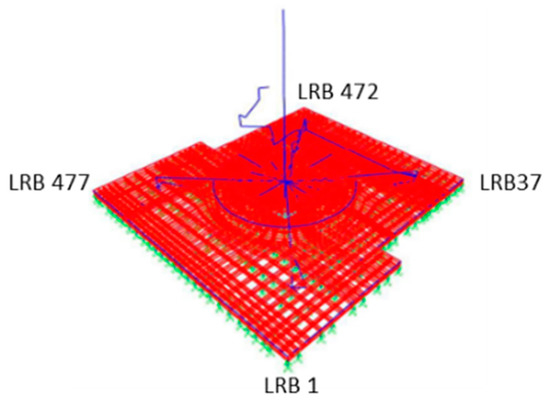 The structural model of the APR1400 including a seismic isolation system consisting of 486 bearings was initially developed in SAP2000 by KEPCO E & C. KEPCO, which is in charge of designing NPPs in Korea, developed a simplified Archetype Nuclear Test (ANT) stick model, as shown in Figure 1 [18]. The superstructure is modeled as beam–stick elements with lumped masses and the base mat is modeled using three dimensional solid elements. The reactor containment building (RCB) and the auxiliary building (AB) are located at the center of the model. The isolators are attached at the bottom of the base mat. The total weight of the nuclear island including base mat, reactor, RCB, and AB is 4732 MN. This SAP2000 model was then converted to an OpenSees format for hybrid simulations and parametric analysis [10]. The model was checked to ensure successful conversion, as shown by the modal frequencies of both models in Table 1 [18].