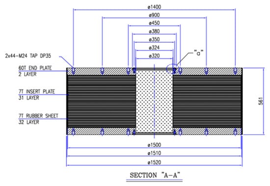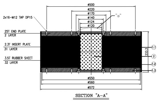 To obtain more data on the capacity of the LRBs, additional experiments were conducted on bearings smaller in size than those presented earlier for the model development. The dimensions of the LRB specimens are shown in Figure 14 [13,28,29]. The diameters of the LRB and lead core were 550 mm and 120 mm, respectively, and the total rubber thickness was 112 mm. Fifteen specimens, as listed in Table 4, were tested until failure. It should be noted that these specimens had experienced horizontal loading prior to the failed test and could have been slightly damaged; the LRBs were therefore classified as low damage (LD), moderate damage (MD), and high damage (HD) for previously experienced shear strain levels of 100%, 300%, and 400%, respectively [18]. The fourth column in Table 4 lists the experimental variable P/Pd, which is the ratio of the axial load to the design axial load, ranging from 0 to 6. Each test was performed by horizontal displacement control loading under these axial loading conditions.