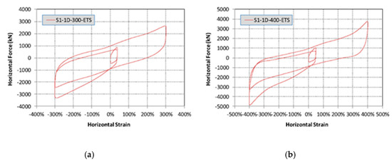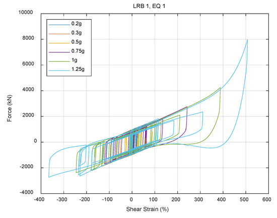 KAERI conducted full-scale tests of LRBs designed for NPPs in 2014. As shown in the schematic in Figure 2, the diameters of the LRB and lead core were 1500 mm and 320 mm, respectively, with 32 layers of 7 mm thick rubber stacked to give a total rubber height of 224 mm. Two LRBs were tested, where each specimen experienced various motions including sine wave motion, elliptical trace sinusoidal motion, and earthquake response motion. Shear strain up to 500% at three frequencies (0.01 Hz, 0.2 Hz, and 0.5 Hz) was tested at the design axial load, 22,000 kN. Detailed explanations of the experiments can be found in previous reports [13,14,20,21]; Figure 3 presents an example of experimental results obtained from the tests.
