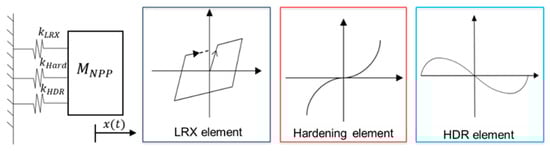 A parallel numerical model of an isolator representing an LRB was suggested by Mosqueda, Marquez, and Hughes [12,19]. The characteristic behaviors of the LRBs, such as a reduction in strength due to the heat of the lead and hardening at large strain, as shown in Figure 3, are modeled using three elements: an LRX element, a Bouc–Wen (hardening) element, and an HDR element, which are all separately available in OpenSees [22], as shown in Figure 4.