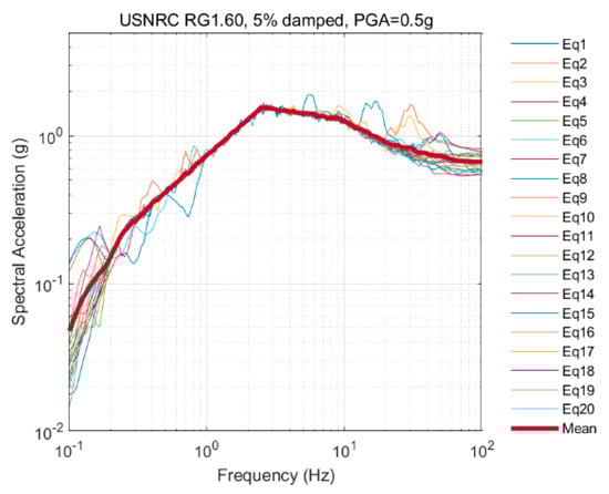 The Pacific Earthquake Engineering Research Center (PEER) published a technical report [25] as the outcome of a research project conducted in tandem with KEPCO. In this project, a set of 20 ground motions were selected from the PEER NGA-West1 database, such that they match the mean and dispersion of a target response spectrum [25]. Using RSPMatch, each of the selected dispersion-appropriate records was individually matched to a single target spectrum corresponding to 5% damping [25]. Table 3 shows the properties of the 20 ground motions used for this research, with the mean spectrum matched to the 5% damped USNRC RG1.60 (U.S. Nuclear Regulatory Commission Regulatory Guide 1.60) target spectrum as shown in Figure 6. USNRC RG1.60 specifies design response spectra for the seismic design of NPPs [26]. For ground motion with various peak ground acceleration (PGA) levels, an amplification factor is applied to the motions in Figure 6.
