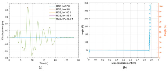 Displacement response of nuclear power plant (NPP): (a) time histories and (b) maximum displacement for the ground motion in Figure 7.