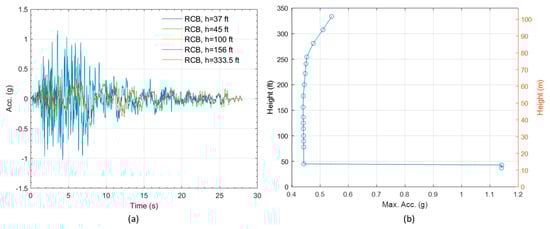 Acceleration response of NPP: (a) time histories and (b) maximum acceleration for the ground motion in Figure 7.