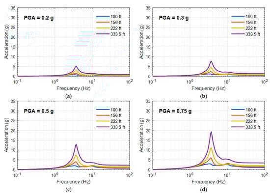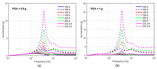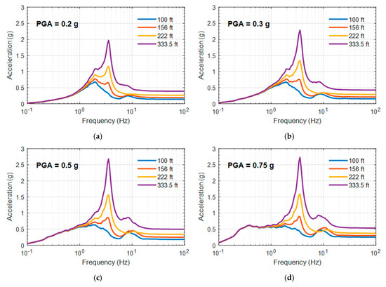 The floor response spectra (FRS) is another essential aspect in the analysis of the seismic fragility of equipment as well as risk assessment, as discussed in previous reports [27]. Figure 11 and Figure 12 exhibits the mean FRS of the 20 motions in Table 3; more specifically, Figure 11 shows the FRS of a non-isolated NPP at 30.5 m (100 ft), 47.5 m (156 ft), 67.7 m (222 ft), and 101.7 m (333.5 ft) of the RCB, and Figure 12 shows the FRS of a base-isolated NPP using the bearing model based on the experiments described in Section 2.2. As shown in Figure 12, the peaks at the isolation system frequency (about 0.5 Hz) become notable as the ground motion becomes stronger. Additionally, the responses are amplified depending on the elevation at the frequency of the RCB (about 3.5 Hz).