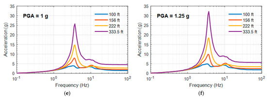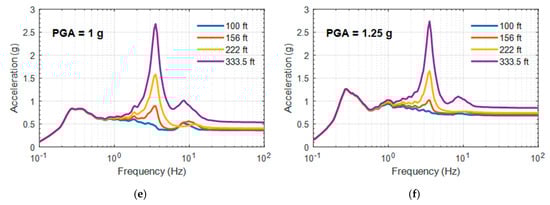 FRS of a non-isolated reactor containment building (RCB) at various peak ground acceleration (PGA) levels: (a) PGA = 0.2 g; (b) PGA = 0.3 g; (c) PGA = 0.5 g; (d) PGA = 0.75 g; (e) PGA = 1 g; (f) PGA = 1.25 g.