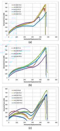Force-displacement relationship of the LRBs for P/Pd ratios of (a) P = 1.0 Pd, (b) P = 0–1.5 Pd, and (c) P = 2.0–6.0 Pd.