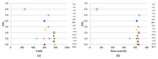 The failure criteria of the LRBs can be represented by an ultimate property diagram (UPD) [30]. The vertical load on an LRB affects its failure mode and shear failure capacity; the UPD shows this relationship, namely between the axial load and the shear load or strain of the limit state. In this research, UPDs were predicted experimentally because of difficulties in numerical analysis.