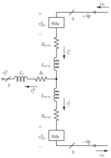 In Figure 2, one leg of the MMC is depicted, where superscript . is denotes AC voltage; and are reactor inductance and resistance, respectively; and and represent equivalent arm resistance and inductance, respectively. The equivalent capacitance of one arm is denoted as , where C is a capacitance used in the submodule. It is assumed that the grid is balanced, has a symmetric monopolar configuration, and the voltage at the HVDC side is equal .