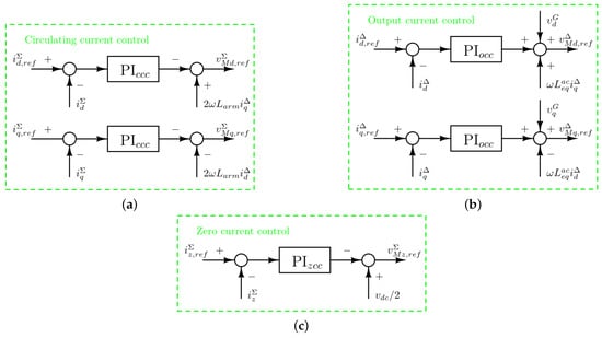 MMC’s inner PI controlling loops for (a) circulating current, (b) output current, and (c) zero current.