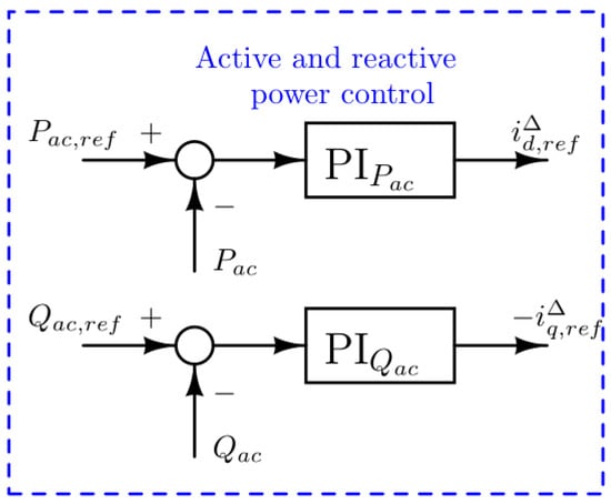 Power control is suitable for the AC grid connected converters, since they have to provide sufficient active power to ensure good operation of the power system. Since we have tested the network identification algorithm and a response of an MMC to the load requirements, we have ensured that the converter provides the desired active and reactive power reference. The PI active and reactive power controller is depicted in Figure 5.