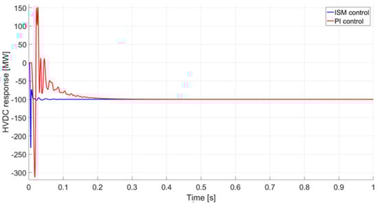 Output active power of HVDC in the case of ISMC and PI control when the reference value is set to is shown in Figure 6. It can be noticed that ISMC provides a faster response with smaller overshoot compared to PI control when it takes more than 0.2 s for output active power to reach reference value. Thus, application of ISMC is well justified.