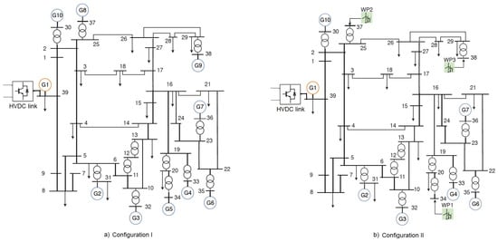 Configuration I of the IEEE 39 bus test system from Figure 7a consists of ten generators represented as a six-order state-space model for the synchronous machine and includes a prime mover and an IEEE DC type 1 excitation system for automatic voltage regulation. Power plants have identical primary frequency controllers and fast static exciters. The generator model includes a primary frequency control with a static droop coefficient . The load is represented as constant power and it is independent on the frequency variations while the transmission lines are modeled as single PI sections.The generator G1, connected to bus 39, represents the aggregation of a large number of generators of the power system of New York that is interconnected with the New-England power system and represented in detail. Therefore, the HVDC interconnection link is also connected to bus 39 as it connects two power systems.