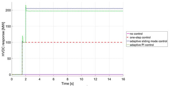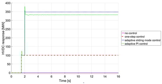 PI control introduces a delay that is neglected in the simple relations for adaptive control in Section 2. It should be noted that the delays are small but they are important in the FFR since they cause the error that results in insufficient response. ISMC allows better and faster HVDC response and enables efficient control of the frequency without endangering the stability of the HVDC. Therefore, ISMC is the only control implemented in Simulations 3 and 4.