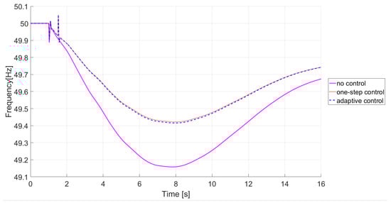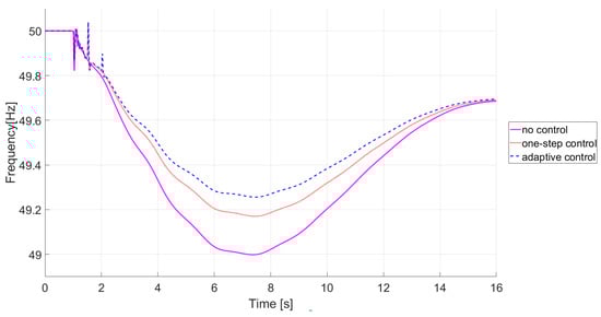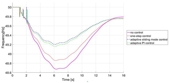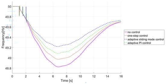 Output active power of the HVDC in three scenarios for Simulation 1 in the case of sliding mode control and PI control is shown in Figure 8. Comparing the initial output active power of HVDC in the case of sliding mode control and PI control, it can be noticed that the HVDC response in the case of PI control is slower and takes more time to reach the specified reference value. This delay affects the accuracy of the estimated size of disturbance and gives a smaller value of the adaptive step of the HVDC response. The difference in output and reference value causes the miscalculation and gives the adaptive step that is undervalued. Consequently, the frequency goes below 49.2 Hz (Figure 9) and can trigger load shedding. In Figure 8, it is also visible that SMC-controlled MMC provides smaller overshoot of the power than PI controlled. With a one-step HVDC response, the output power is constant and has a value of 100 MW. In the case of adaptive control of HVDC, initial output power is equal to 100 MW and the second step has a value of 205 MW in case of sliding mode control; while with PI control, it is equal to 197 MW. The output power of the second step of HVDC response is smaller than the size of the disturbance because the aim of the fast frequency support from HVDC is not to establish power balance but to decelerate frequency decay and provide enough time for primary frequency control to restore load-generation balance. The output reactive power of HVDC is omitted on purpose since the HVDC barely feeds reactive power to the grid. This is because constant reactive power is given as a reference () to the controller, and the active and reactive power are controlled independently. Figure 9 represents the frequency measurements at bus 39, where the HVDC link that is produced by PLL is connected.