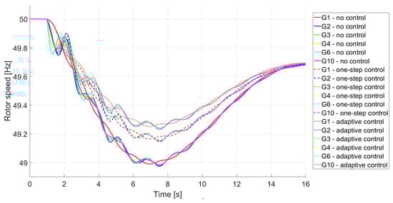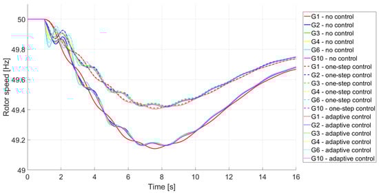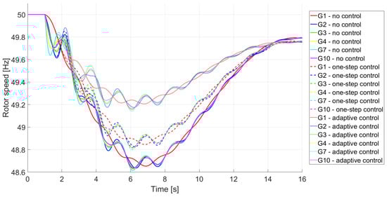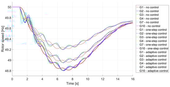 The same contingency from Simulation 1 is tested for Configuration II of the test system, i.e., the tripping of generator G6 that causes about 800 MW of generation loss (Simulation 2). The output active power of the HVDC response in three scenarios for Simulation 2 in the case of sliding mode control and PI control is shown in Figure 11. Figure 12 represents the frequency measurements at bus 39 where the HVDC link that is produced by PLL is connected. With a one-step HVDC response, the output active power is constant and has a value of 100 MW. In the case of adaptive control of HVDC, initial output power is equal to 100 MW; while the second step has a value of 348 MW in the case of sliding mode control and 334 MW in the case of PI control. The delay introduced by PI control results in underestimation of the size of disturbance causing the smaller HVDC response, insufficient to maintain the frequency above 49.2 Hz (Figure 12). The output power of the second step of HVDC response in a low-inertia configuration is larger than the second step of HVDC response in high-inertia configuration that confirms that adaptive control considers the inertia of the test system. Generators’ rotor speed responses in Simulation 2 are presented in Figure 13. Configuration II is low-inertia configuration and experience larger frequency decreasing velocity and magnitude compared to Configuration I for the disturbance of the same size. These results were expected since the low-inertia systems are more sensitive to disturbance. The frequency nadir for the case where there is no HVDC FFR response is below the threshold value of load shedding and it is equal to 48.67 Hz. One-step HVDC response provides a higher frequency nadir equal to 48.83 Hz, but it is below the threshold for load shedding. The two-step HVDC response gives frequency nadir equal to 49.2 Hz and keeps the frequency within safe boundaries. Simulation results confirm that the proposed HVDC control achieves adequate frequency response within the set limits in systems with different inertia levels while trying not to over-exploit the HVDC contribution. The adaptive step of HVDC response is proportional to the size of the estimated disturbance and initial RoCoF that is higher in low-inertia configuration compared to the same size disturbance in high-inertia configuration.