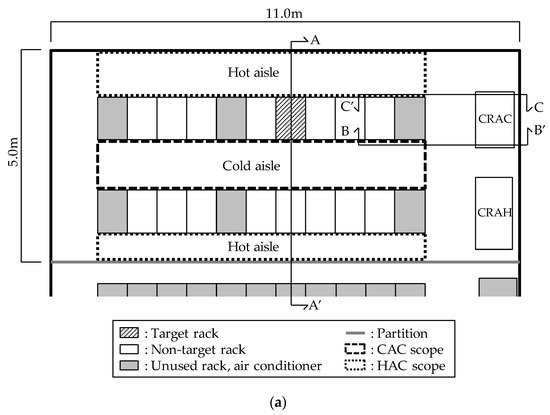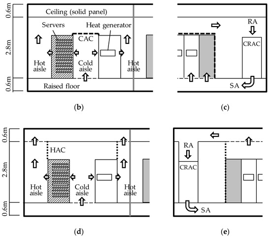 Full-scale experimental room: (a) Floor plan; (b) section A-A’ with cold-aisle containment (CAC); (c) section B-B’ with CAC; (d) section A-A’ with hot-aisle containment (HAC); and (e) section C-C’ with HAC.