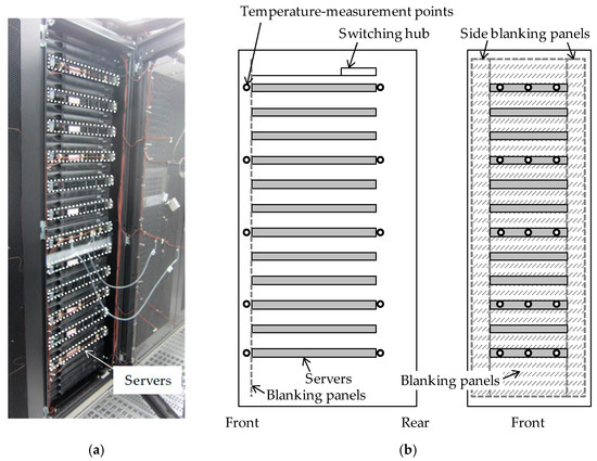 Server installation status and temperature-measurement points of target rack: (a) Equipment mounting (with blanking panels) and (b) locations of temperature measurement.