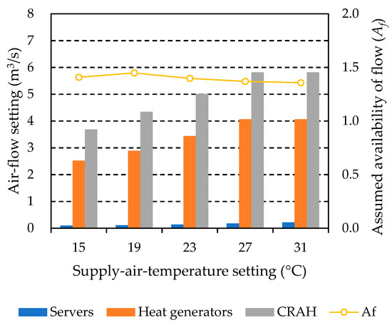 As mentioned above, it is known that the speed of the internal fan of the server fluctuates with varying ambient temperature. Therefore, as shown in Table 5, changing the air-conditioning supply-air temperature changes the ITE airflow; however, it is a concern that changing the balance between ITE airflow and supply-air volume will affect the measurement results. Therefore, a preliminary experiment under certain conditions, namely, with CAC, blanking panels, a CPU usage rate of 50%, and a constant CRAH air volume, was conducted, and the server airflow (i.e., total airflow of 12 servers)—corresponding to the temperature setting of the CRAH air supply (15, 19, 23, 27, and 31 °C)—was obtained. At each supply-air-temperature setting, the airflow of the heat generator was set so that the differences between the inlet and outlet temperatures of the server and the heat generator determined in a preliminary experiment matched. The CRAH supply-air volume was also set so that the ratio of the air-conditioning air-supply volume (mc) to ITE air volume (mi) (i.e., availability of flow (Af)) was close to 1.4. The airflow setting for each determined supply-air temperature setting is shown in Figure 4.