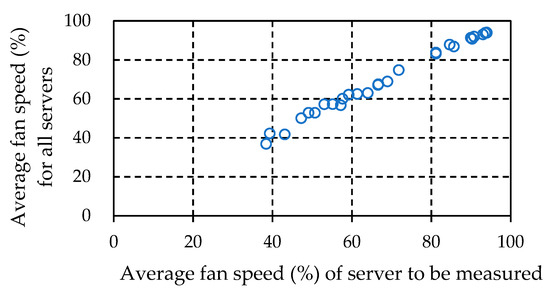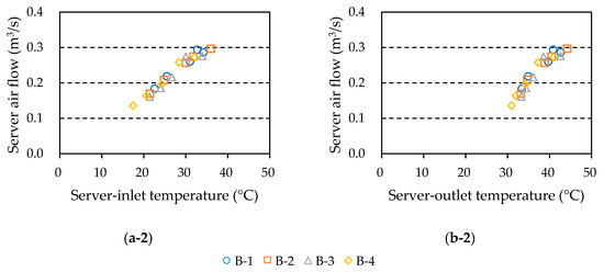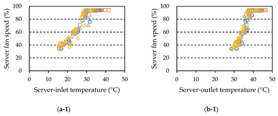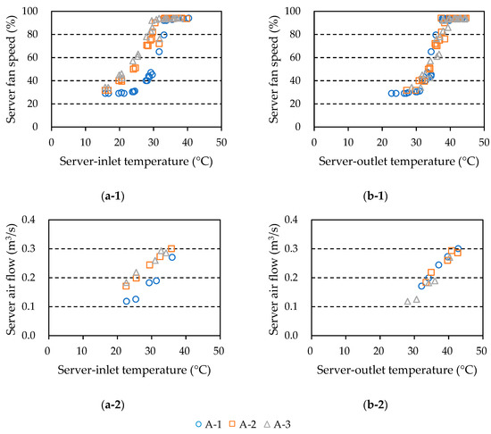 The results of experiment A are plotted in Figure 5, which shows the relationship between server inlet and outlet temperatures and server fan speed (airflow) with server CPU usage as a parameter. As shown in Figure 5a, when the CPU usage rate is 0%, the fan speed (airflow) corresponding to the server inlet temperature is lower than those values for the other CPU usage rates. It can be said that the relationship between server inlet temperature and server airflow differs according to CPU usage rate. On the contrary, it can be seen from Figure 5b that server outlet temperature and server-fan speed (airflow) have the same correlation regardless of CPU usage rate. As mentioned above, ITE controls the built-in fan speed to keep the temperature of the components at the target value [14]. As the CPU usage rate increases, the CPU load increases, so the server-fan speed (airflow) is increased to maintain the target temperature of the CPU. Therefore, it is considered that there is no difference in the server-outlet temperature after heat exchange depending on the CPU usage rate.