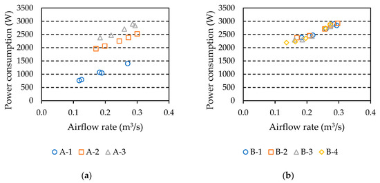 Relationship between total airflow rate and total power consumption of 12 servers (experiments A and B): (a) Results of experiment A, (b) results of experiment B.