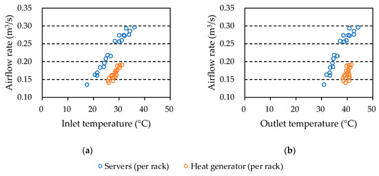 To confirm whether the heat generator can reproduce the relationship between temperature and airflow rate plotted in Figure 6a-2,b-2, the ambient temperature of the equipment and airflow rate per rack are plotted in Figure 9. As mentioned above, 12 servers were installed in each rack, and one heat generator was installed in each rack. When the results were confirmed, although the variation range of airflow was narrow, because the variable speed range of the built-in fan of the heat generator was narrow, the heat generator was able to roughly reproduce the “tilt” of the 12 servers in terms of both inlet temperature and outlet temperature.