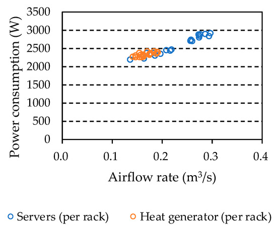 The relationship between airflow rate and power consumption of the heat generator is shown in Figure 10. The results of experiment B were used as the numerical values of the servers to be compared. As mentioned above, although fluctuation in the airflow rate of the heat generator was in the low airflow-rate range of the server, it can be seen that the power consumption tended to increase as the built-in fan of the heat generator accelerated.