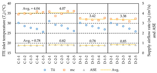 To obtain the values of the given conditions used for prediction, ITE inlet temperature (Tii), CRAC supply-air amount (mc), ASE, and ITE-related empirical equations are confirmed hereafter. The experimental results for Tii, mc, and ASE under the respective experimental conditions are shown in Figure 11. As given conditions, Tii uses the respective measured values, and mc and ASE use the average values of C-1, C-2, D-1, and D-2. As the airflow setting of the CRAC is fixed, mc is almost constant under each airflow scheme. However, mc of the ceiling-inlet method was smaller than that of the horizontal-inlet method. It is probable that mc of the ceiling-inlet method was small due to increased pressure losses such as those due to the ceiling inlet port, the inside of the ceiling, and the return-air duct (from the ceiling to the CRAC inlet port).