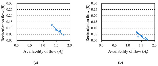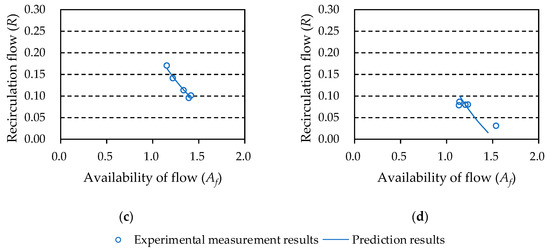 Experimental and prediction results for recirculation flow (R) with respect to availability of flow (Af): (a) C-1, (b) C-2, (c) D-1, and (d) D-2.