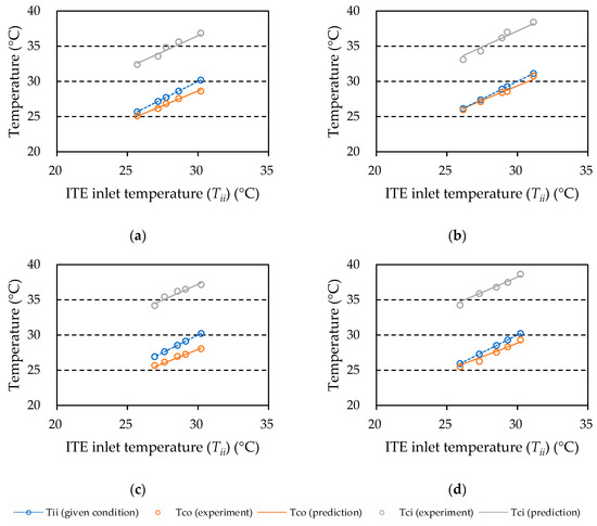 Experimental and prediction results for supply-air temperature (Tco) and return-air temperature (Tci) with respect to ITE inlet temperature (Tii): (a) C-1, (b) C-2, (c) D-1, and (d) D-2.