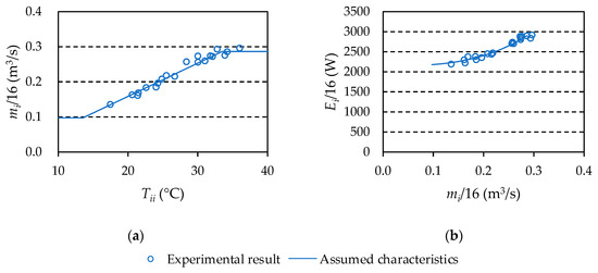 The characteristics of the ITE (servers) were determined by the least-squares method from the values measured in experiment B. The results of experiment B and the characteristics of the assumed ITE are shown in Figure 14. The ITE airflow rate shown in Figure 14a was set to the upper limit at 34 °C or higher and the lower limit at 13 °C or lower. It was determined by estimating the ITE inlet temperature (Tii) for which server-fan speed has maximum and minimum values, as shown in Section 4.2.1.