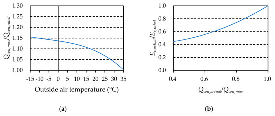 Examples of characteristics of CRAC: (a) Change in maximum sensible cooling capacity with respect to outside-air temperature (return-air conditions, airflow, and external static pressure (ESP) are as listed in Table 9) and (b) change in power consumption with respect to partial load (return-air conditions and outdoor-air condition, airflow, and ESP are as listed in Table 9), where Ec,actual is actual power consumption of the CRAC, Ec,rated is rated power consumption of the CRAC, Qsen,actual is actual sensible cooling capacity, Qsen,max is maximum sensible cooling capacity, and Qsen,rated is rated sensible cooling capacity.