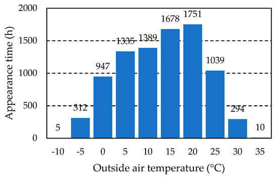 To estimate total energy consumption of the CRAC, annual power consumption is calculated. The power consumption in 5 °C increments is calculated, and duration times of outside-air temperature in increments of 5 °C are added up. The duration time used is meteorological data for Tokyo [23] published on Energy Plus. It is plotted in Figure 16.