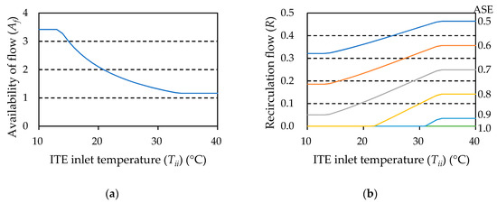 The results of calculating the availability of flow (Af) and circulation flow (R) in regard to ITE inlet temperature (Tii) for each ASE by performing steps 1 to 5 shown in Table 1 are shown in Figure 17. As shown in Figure 17a, Af decreases with Tii. In this prediction, Af ranges from 1.2 to 3.4. Moreover, when Af decreases, the amount of air supplied to meet the required airflow rate to the ITE shifts to the insufficient side, so the recirculation flow tends to increase. Actually, as shown in Figure 17b, R increases as Tii increases. When ASE is 1, recirculation does not occur (R = 0), but when ASE is 0.5, R is 0.46 at maximum, and nearly half of the exhaust-air volume of the ITE is recirculated. In addition, as shown in Figure 14a, the airflow rate of the ITE does not increase nor decrease in the ranges in which the ITE inlet temperature (Tii) is respectively 13 °C or lower and 34 °C or higher. Consequently, R does not fluctuate in those ranges.