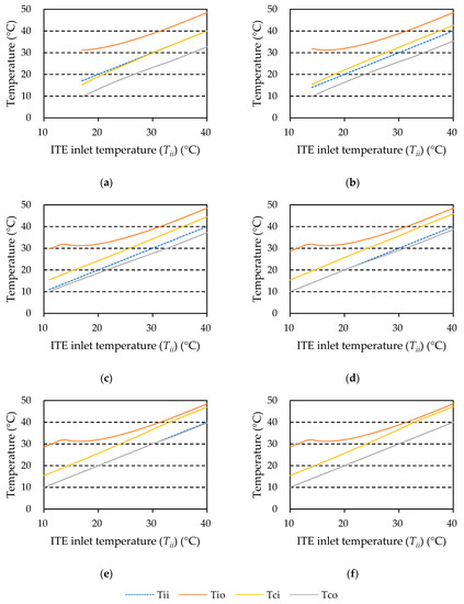 Temperature of each part with respect to ITE inlet temperature (Tii): (a) ASE = 0.5, (b) 0.6, (c) 0.7, (d) 0.8, (e) 0.9, and (f) 1.0.