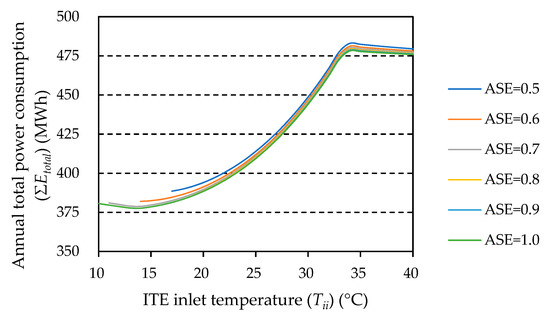 The predicted annual total power consumption (ΣEtotal), which comprises total CRAC annual power consumption (ΣEc) and ITE annual power consumption (ΣEi), is shown in Figure 22. As ΣEi is larger than ΣEc, the range in which CRAC power consumption varies is relatively small, and the effect of a decrease in ITE power consumption due to a decrease in ITE inlet temperature (Tii) is greater. Therefore, in the range of Tii from 14 °C to 33 °C (in which ITE airflow rate varies), as Tii drops, ΣEtotal decreases. As ΣEi does not fluctuate below 14 °C, as Tii drops, ΣEtotal increases due to the influence of ΣEc. As a result, except for the machine room with an ASE of 0.5, which is outside the operable range of the CRAC, ΣEtotal reaches its optimum point at 14 °C. As for the machine room with an ASE of 0.5, the optimum point is to operate at the lower limit of the operable range. Moreover, if Tii is 33 °C or higher, ΣEtotal starts to decrease due to the influence of ΣEc.