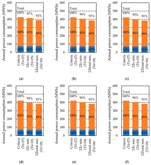 In reality, the data-center operator and the customer often conclude a “service level agreement” (SLA) to define the temperature conditions inside the machine room. Commonly quoted is the “recommended environmental range” in ASHRAE’s thermal guidelines [1]. This envelope requires the dry-bulb temperature of the ITE inlet port to be kept at 18 to 27 °C. The energy-saving effect when ITE inlet temperature (Tii) is changed within that range is verified hereafter. That is, the annual power consumption is calculated under Tii within that dry-bulb-temperature range for minimizing ΣEc and under Tii within that range for minimizing ΣEtotal with Tii of 27 °C as a reference, and the energy-saving effect is verified as follows.
