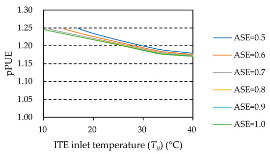 Partial power-usage effectiveness (pPUE) versus ITE inlet temperature (Tii).