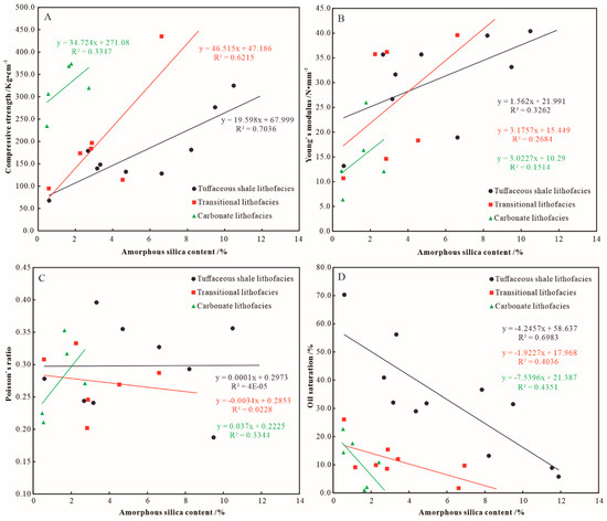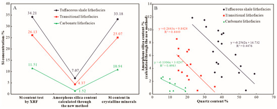 | Well | Depth (m) | Lithofacies | Oil Saturation/% | Young’s Modulus/N*mm−2 | Poisson’s Ratio | Compressive Strength/Kg*cm−2 | Porosity/% | Permeability/mD | Si Content Test by XRF/% | Amorphous Silica Content Calculated Through the New Method/% | Calculated Si Content in Crystalline Minerals/% | Calculated Si Content in Clay Minerals/% |