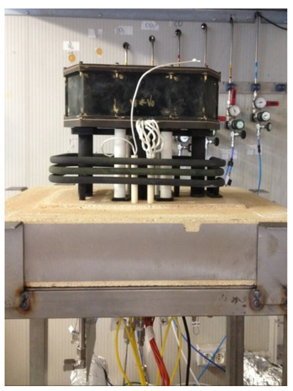 To evaluate the performance of the ammonia-fed SOFC, an experimental campaign was designed and implemented on a SOFC short stack. The experimental study was performed on a six cells short stack supplied by SOLIDPower (SOLIDpower, Mezzolombardo, Italia). The stack is equipped with anode-supported planar cells. Details on stack design are reported in Table 2. Figure 2 is a picture of the test rig with the stack.
