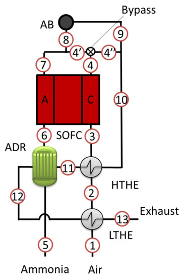 The system model was implemented on a Microsoft Excel© (Microsoft, Washington, DC, USA) calculation sheet using thermodynamic libraries taken from literature [30] and on the basis of the experimental activity outcomes, for what concerns the correlation between voltage and the main operating parameters such as current density, fuel use factor and ammonia decomposition rate. The model is zero dimensional and calculates the energy equilibrium of each component. The system scheme is reported in Figure 3. The proposed design moves from a standard state of the art solution of SOFC systems fed with natural gas. The fuel is decomposed in an external reactor and heat is recovered from the after burner off-gases (stream 10, downstream their mixing with bypassed air) to feed the reactor and to preheat air at high and low temperature.
