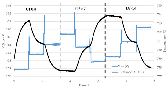 Based on experimental results it was possible to define a function that relates voltage with the investigated parameters. Linear regression was always considered for each parameter. Due to the inconsistency of temperature, regression was performed separately for each temperature. At 750 °C the regression was calculated as expressed by Equation (11).