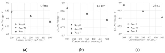 In the following analysis, the results reported refer to the average value of the six cells and calculated as average of 60 s of samples, taken at 1 Hz. To avoid the overlapping with following phase, the 60 s considered for the calculations are two minutes before the new test condition starts. Figure 5 reports the main results in terms of average cell voltage value as function of current density for fuel use of fuel 0.8 (a), 0.7 (b) and 0.6 (c). Each graph reports three curves, one for each XNH3 value. As expected, for all curves, voltages decrease with increasing current and higher Uf values corresponds to lower voltages. Regarding XNH3, there are no significant differences in terms of measured voltage between the three compositions. At higher current density, voltages values of decomposed ammonia are lower compared to ammonia containing mixtures. This trend is coherent for all Uf values and even though the difference is low, pure ammonia tests are slightly more performing than equivalent mixtures.