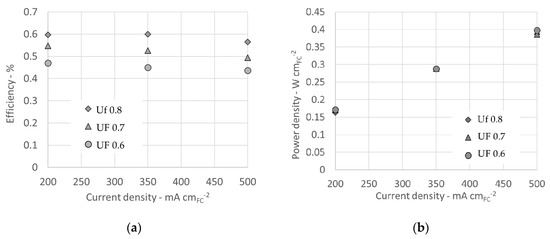 Stack performance in terms of efficiency and power density are reported in Figure 6a,b respectively. The curves report values for different Uf at the constant temperature of 750 °C and constant XNH3 = 0. Since voltages values of the other decomposition rates are extremely close each other, also power densities and efficiencies are similar and not reported. The efficiency of 56% at the higher power density of 38.6 W cmFC−2 was obtained with pure NH3.